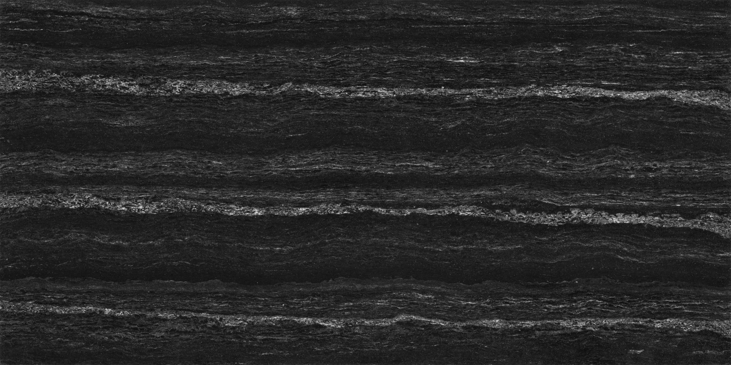 This Keravit tile features an intense deep black stone-inspired design with elegant horizontal mineral streaks in subtle grey and silver tones. The rich layered texture creates a dramatic, high-end natural stone appearance, perfect for adding depth and luxury to modern interiors.