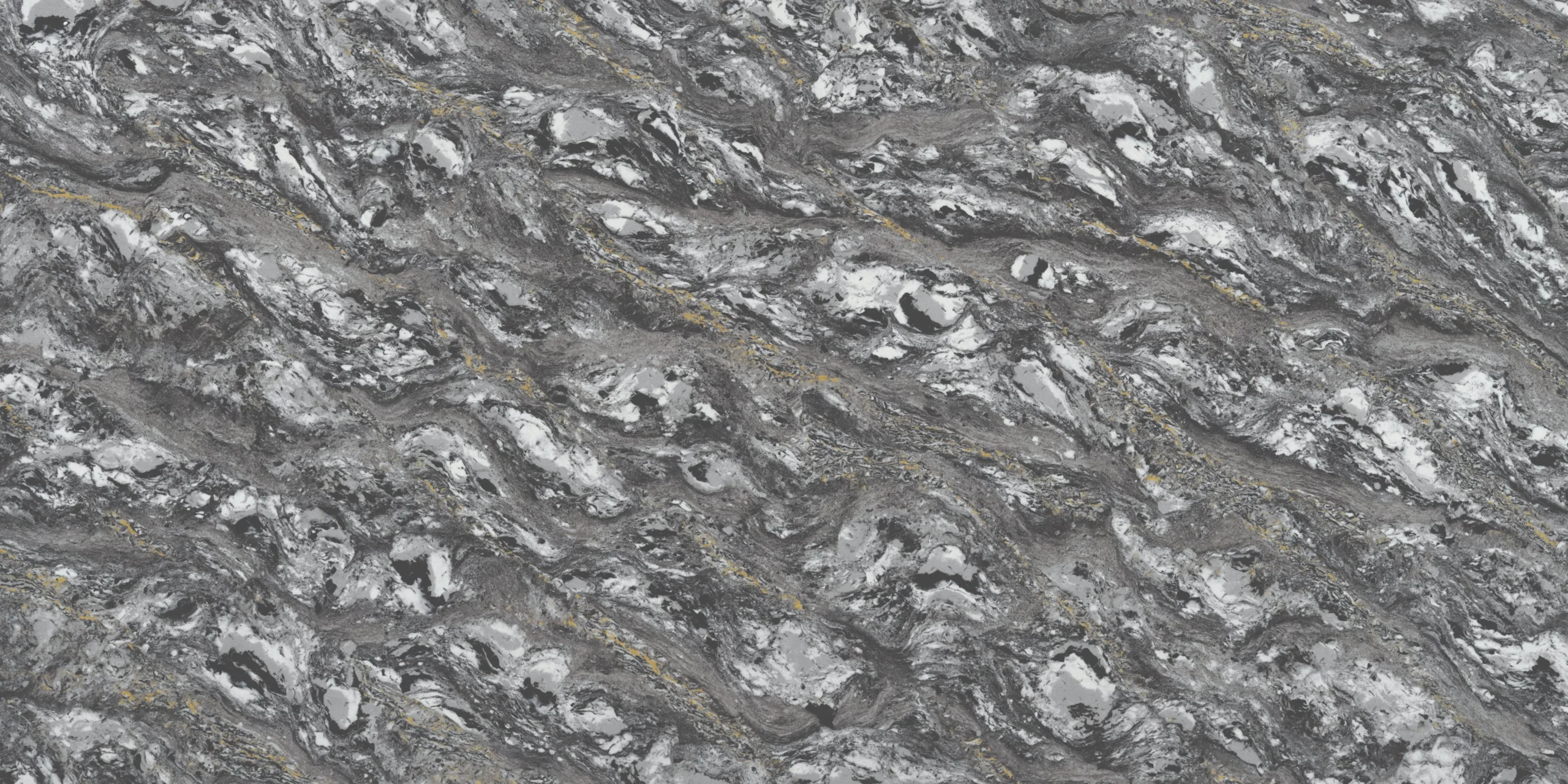 This Keravit tile features a striking grey fusion marble-inspired surface with dramatic swirling patterns in shades of charcoal, silver, and crisp white, enhanced by subtle golden mineral streaks. The bold movement and textured depth create a luxurious natural stone effect, perfect for modern interiors that demand elegance and character.